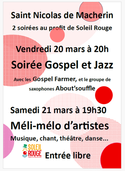 Comme chaque année, à Saint Nicolas de Macherin, un week-end au profit de l'association Soleil Rouge qui fait intervenir des clowns auprès des enfants hospitalisés aura lieu les 20 et 21 Mars. Une tombola avec une centaine de lots est également organisée.