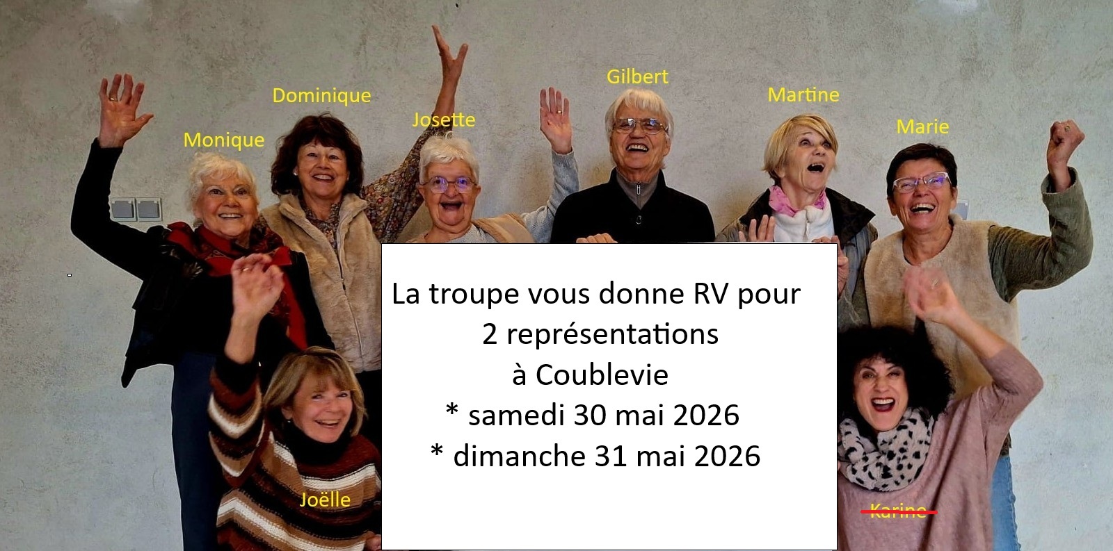 Quant à la pièce proposée, la troupe vous en dira plus dans quelques temps. D'ici là, notez dans vos agendas les dates des représentations à Coublevie, le samedi 30 mai en soirée et le dimanche 31 mai après-midi.